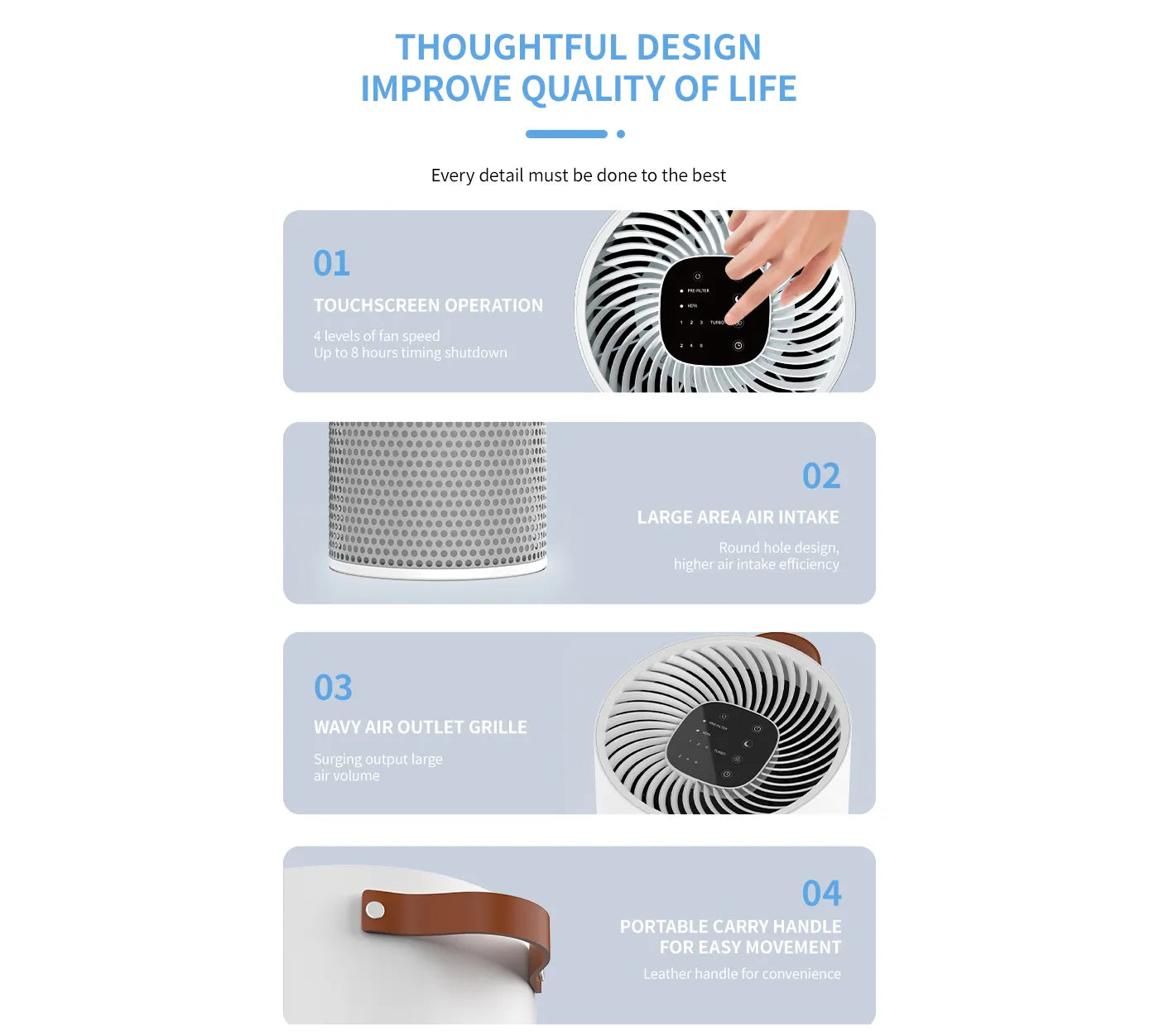 | Funcții | Antibacterian, Temporizator, Child Lock, Purificare aer, Filtrare aer, Elimină mirosurile neplăcute, Funcționare silențioasă, Mod Sleep, Panou tactil, Filtru Carbon Activ, Indicator de schimbare a filtrului, Filtru HEPA H13, Funcție resetare automată |